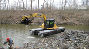 Our amphibious excavator floats in water to enable cleaning of waterways.